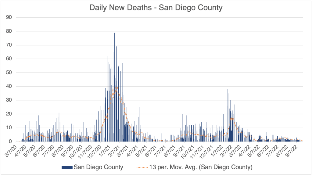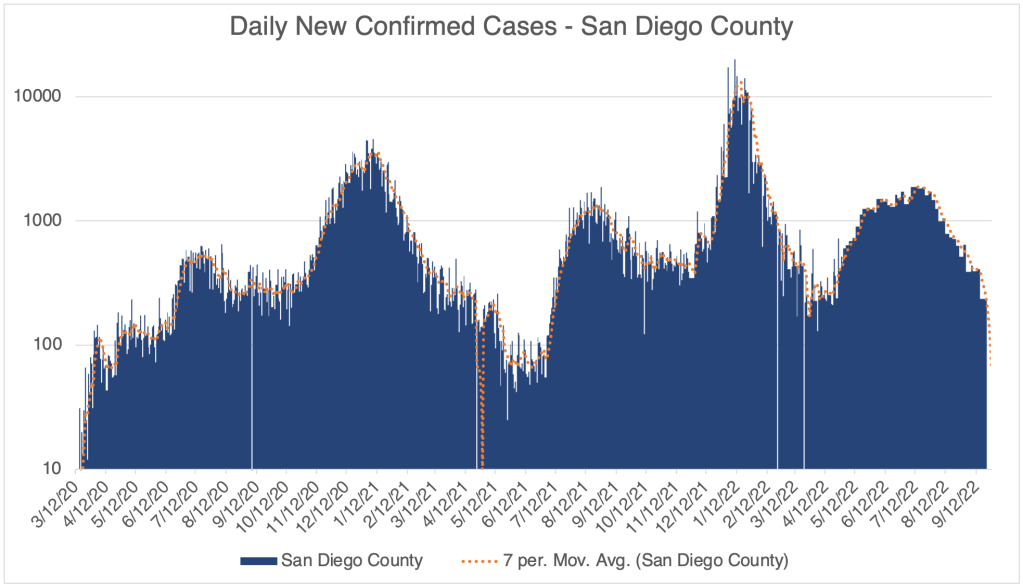 Cases continue to go down in the US, California and San Diego County. Again, since most people are now testing themselves using over the counter tests, the official case numbers are probably a gross underestimation of actual cases. Hospitalizations are a better measure, and they are also going down.