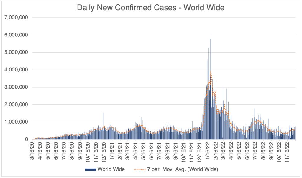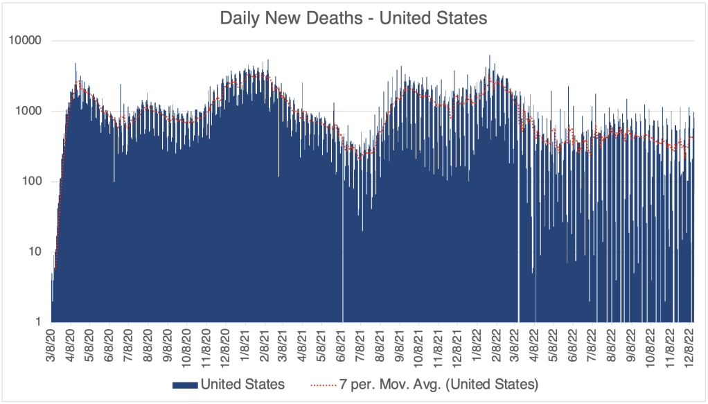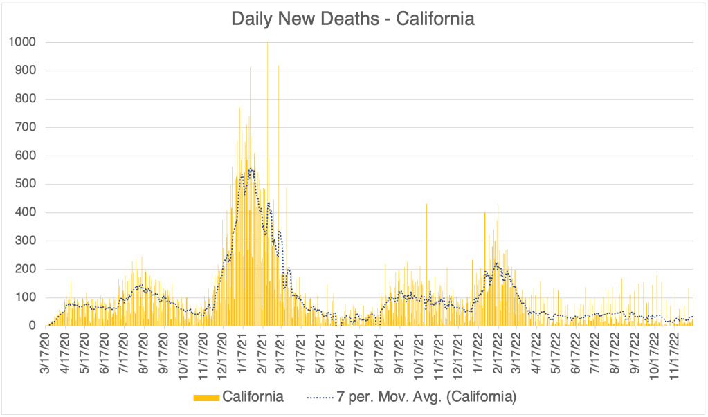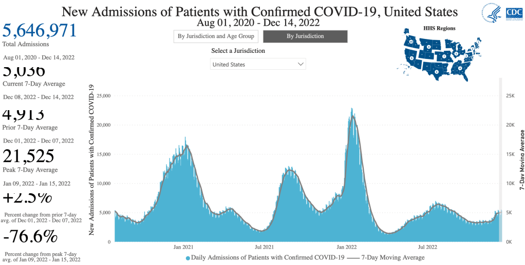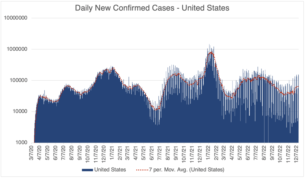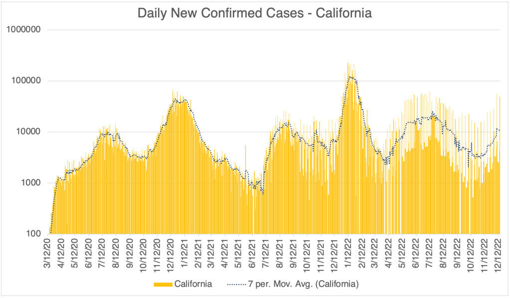 There has been a modest rise in cases in the past few weeks, suggesting that we will have a winter wave of cases. So far, this wave is not nearly as high as last December, when the Omicron variant first became dominant in the US. This is according to official testing data. Many are no longer being testing in a medical setting, so the number is likely much higher.