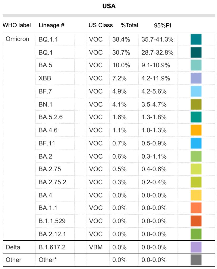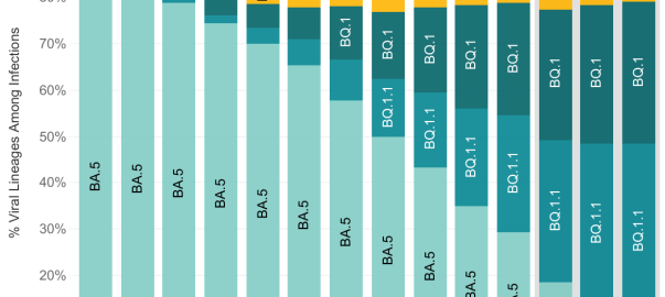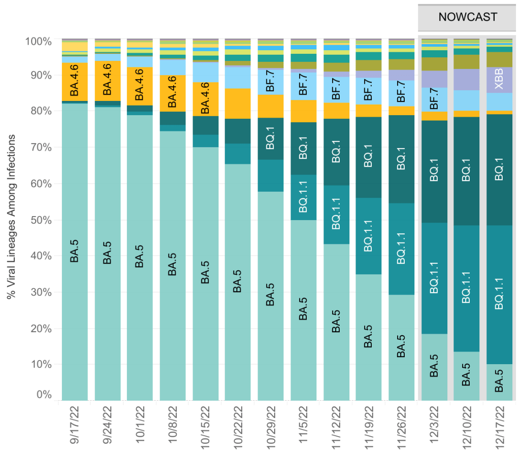 The BA.5 variant now represents only 10% of currently circulating COVID variants. There are currently 12 variants circulating in significant numbers, the most common being BQ.1.1.