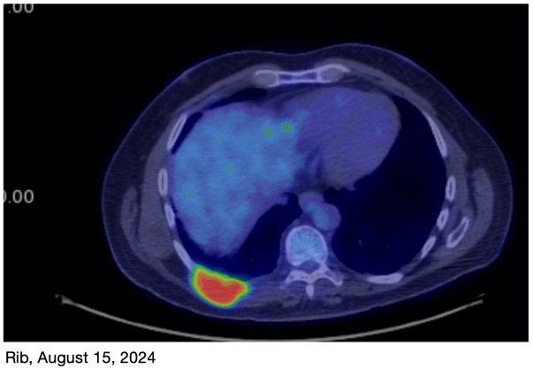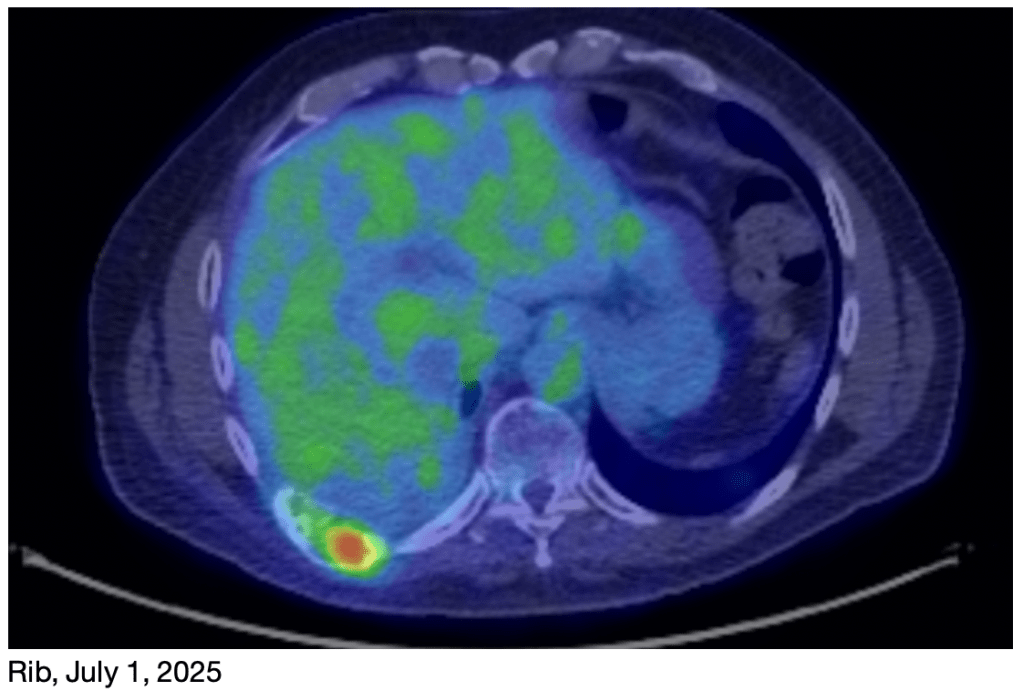 As you can see in the images, the rib tumor was basically absent in the March 30th image, but has reappeared in the image from this week (July 1st).