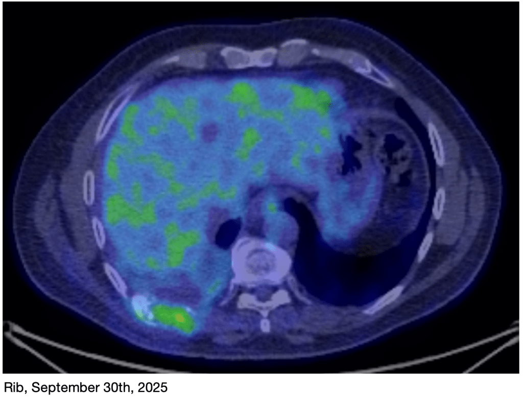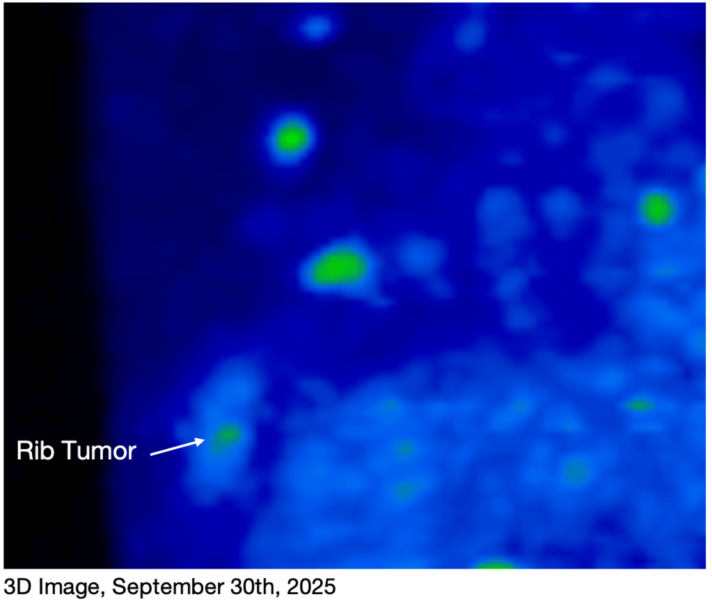 This is a brief but important cancer update. I know it’s been a long time since my last update, but we haven’t had significant news for awhile. As you’ve read before, I’m going through a new set of chemo treatments right now, in response to my July PET scan results. I’m in my 4th round right now, with my 5th of 6 scheduled treatments happening next week. My NGS test results from a few weeks ago show that the new rib tumor is genetically the same as the original one, so the same chemo agents should continue to be effective.