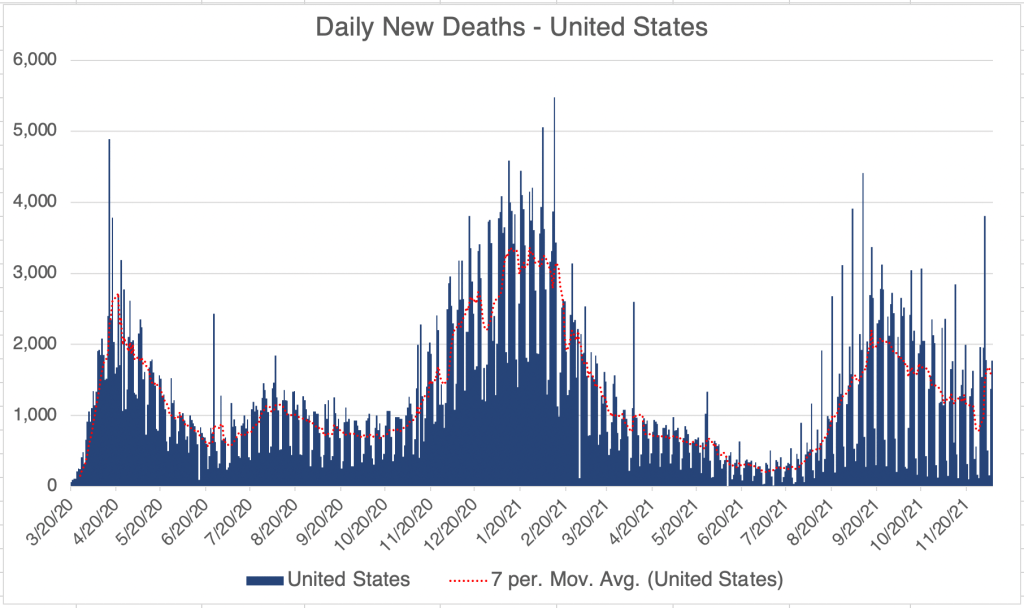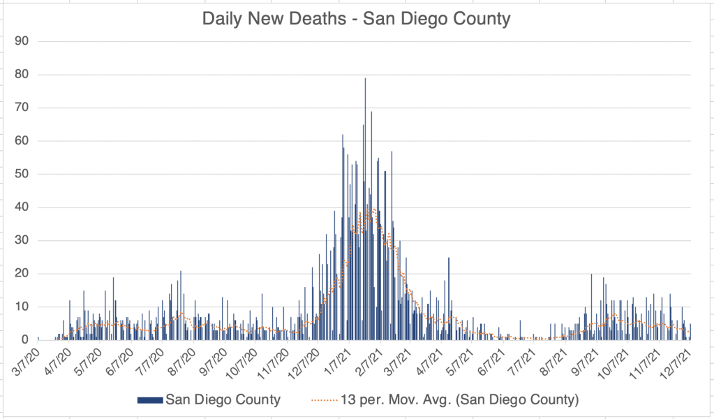 2) Low fatality in older populations: South Africa has a relatively young population, so reports of mild symptoms may not carry over to countries with older populations. The UK data from this week suggests that Omicron deaths will be low, even in older populations. We are seeing a slight drop in deaths already.