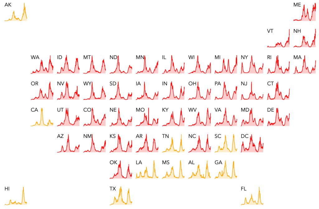 All that being said, cases are still extremely high in every state in the US right now, and still rising. Only Washington DC appears to be seeing a drop in cases right now. Deaths have not yet started to increase in the US. Deaths have tended to increase between 2 and 5 weeks after the start of a peak, so it’s still too early to know how high they will be.