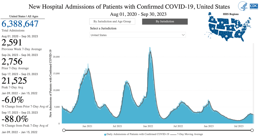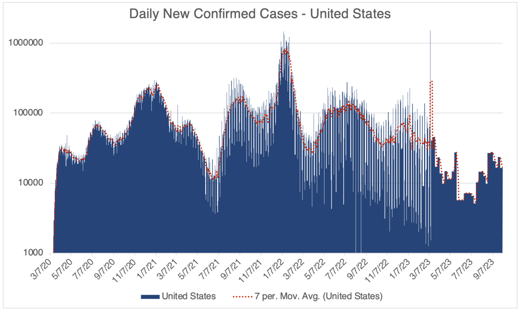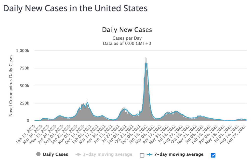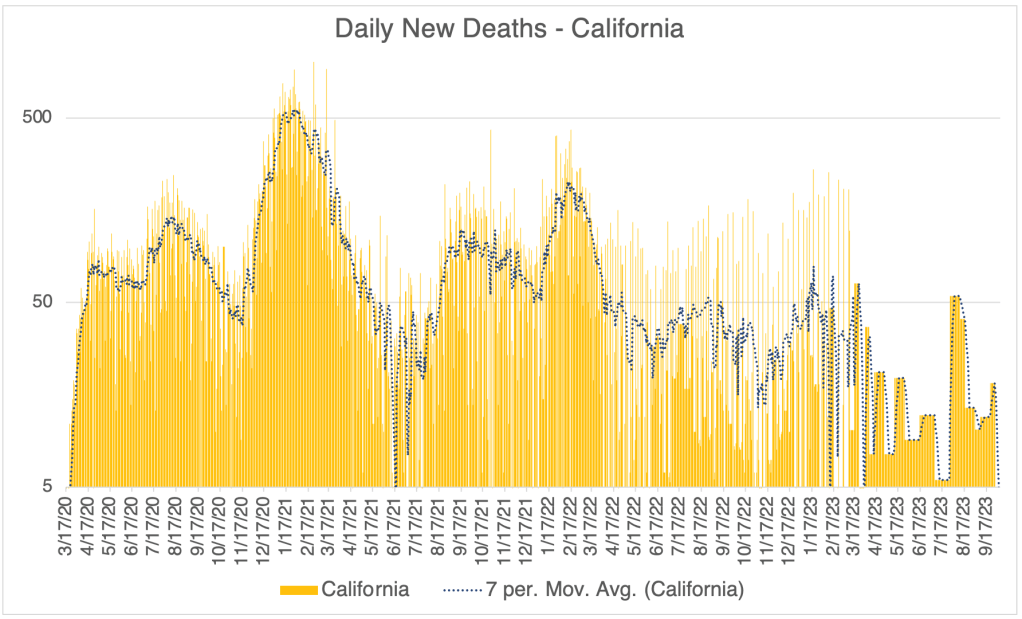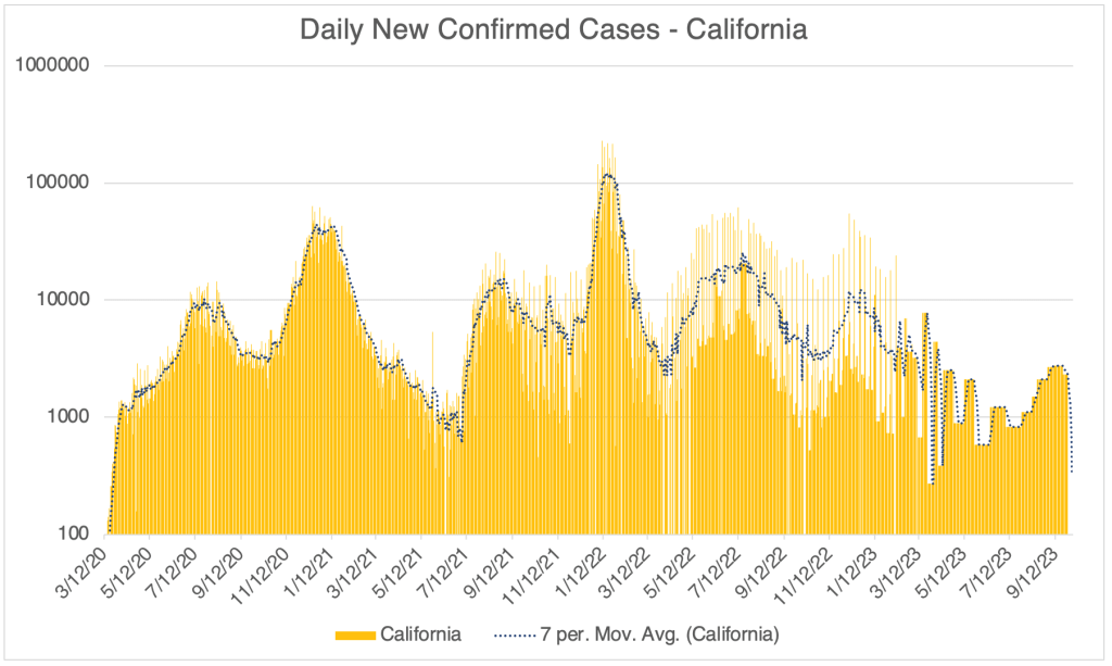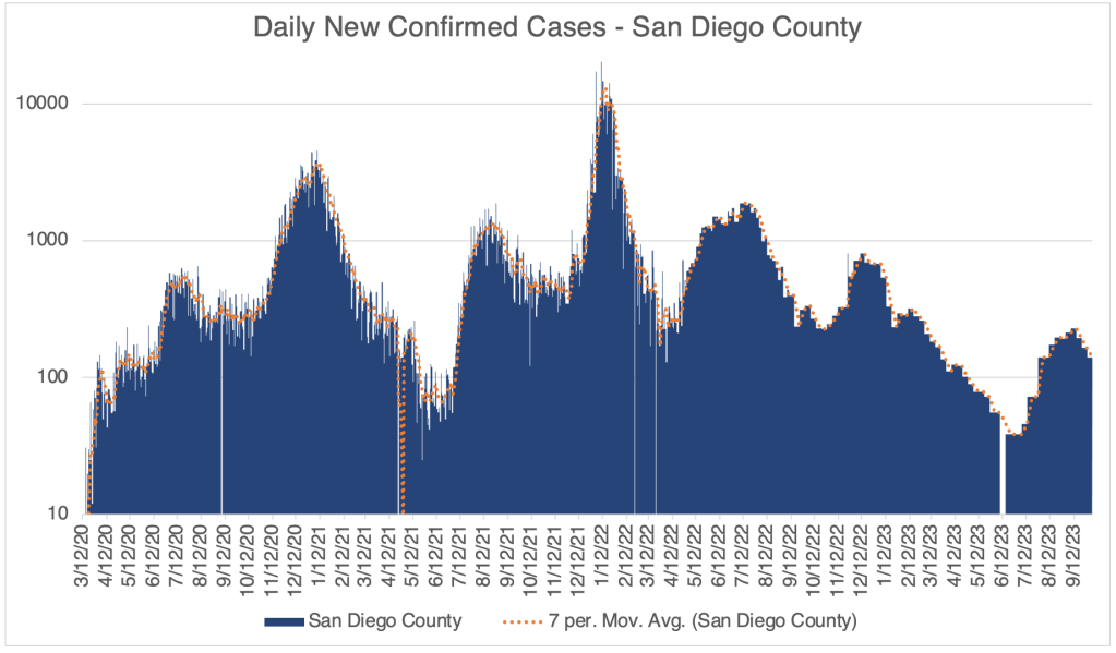 Graph is by me, from data collected from Johns Hopkins University COVID site. Graph is presented in a logarithmic format to emphasize small numbers. Note that each number on the left is 10x higher than the one below it. Data since March 10, 2023 is from Worldometer.Graph is by me, from data collected from Johns Hopkins University COVID site. Graph is presented in a linear format. Data since March 10, 2023 is from Worldometer.Hospitalizations, from the CDC website.The current EG.5 wave barely registers on the far right of this linear graph. Daily US New Cases, Worldometer/coronavirus/us.Graph is by me, from data collected from Johns Hopkins University COVID site. Graph is presented in a logarithmic format to emphasize small numbers. Note that each number on the left is 10x higher than the one below it. Data since March 10, 2023 is from Worldometer.Graph is by me, from data collected from Johns Hopkins University COVID site. Graph is presented in a logarithmic format to emphasize small numbers. Note that each number on the left is 10x higher than the one below it. Data since March 10, 2023 is from Worldometer.Graph is by me, from data collected from San Diego County Public Health. Graph is presented in a logarithmic format to emphasize small numbers. San Diego County now only releases information on Thursday each week. Data points shown are extrapolated using this information.Graph is by me, from data collected from San Diego County Public Health. Graph is presented in a logarithmic format to emphasize small numbers. San Diego County now only releases information on Thursday each week. Data points shown are extrapolated using this information.Graph is by me, from data collected from Johns Hopkins University COVID site. Graph is presented in a logarithmic format to emphasize small numbers. Note that each number on the left is 10x higher than the one below it. Data since March 10, 2023 is from Worldometer.From the CDC page on Variant Proportions for the United States. Updated for September 30th, 2023.