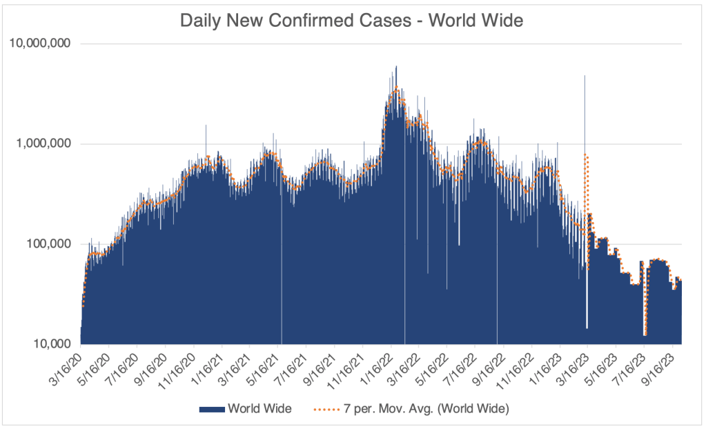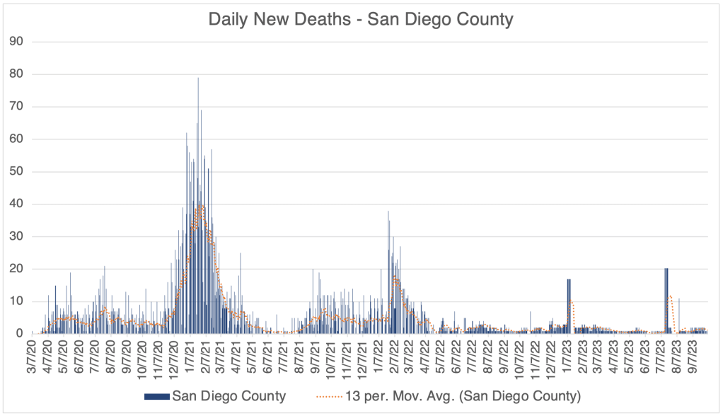 Graph is by me, from data collected from Johns Hopkins University COVID site. Graph is presented in a logarithmic format to emphasize small numbers. Note that each number on the left is 10x higher than the one below it. Data since March 10, 2023 is from Worldometer.Graph is by me, from data collected from Johns Hopkins University COVID site. Graph is presented in a logarithmic format to emphasize small numbers. Note that each number on the left is 10x higher than the one below it. Data since March 10, 2023 is from Worldometer.Hospitalizations, from the CDC website.The current EG.5 wave barely registers on the far right of this linear graph. Daily US New Cases, Worldometer/coronavirus/us. Graph is by me, from data collected from Johns Hopkins University COVID site. Graph is presented in a logarithmic format to emphasize small numbers. Note that each number on the left is 10x higher than the one below it. Data since March 10, 2023 is from Worldometer.Graph is by me, from data collected from Johns Hopkins University COVID site. Graph is presented in a logarithmic format to emphasize small numbers. Note that each number on the left is 10x higher than the one below it. Data since March 10, 2023 is from Worldometer.Graph is by me, from data collected from San Diego County Public Health. Graph is presented in a logarithmic format to emphasize small numbers. San Diego County now only releases information on Thursday each week. Data points shown are extrapolated using this information.Graph is by me, from data collected from San Diego County Public Health. Graph is presented in a logarithmic format to emphasize small numbers. San Diego County now only releases information on Thursday each week. Data points shown are extrapolated using this information. Apparent spike in deaths in July 2023 likely represents a glut of cases reported all at once.Graph is by me, from data collected from Johns Hopkins University COVID site. Graph is presented in a logarithmic format to emphasize small numbers. Note that each number on the left is 10x higher than the one below it. Data since March 10, 2023 is from Worldometer.World Wide Daily COVID Deaths, Worldometer/coronavirus.