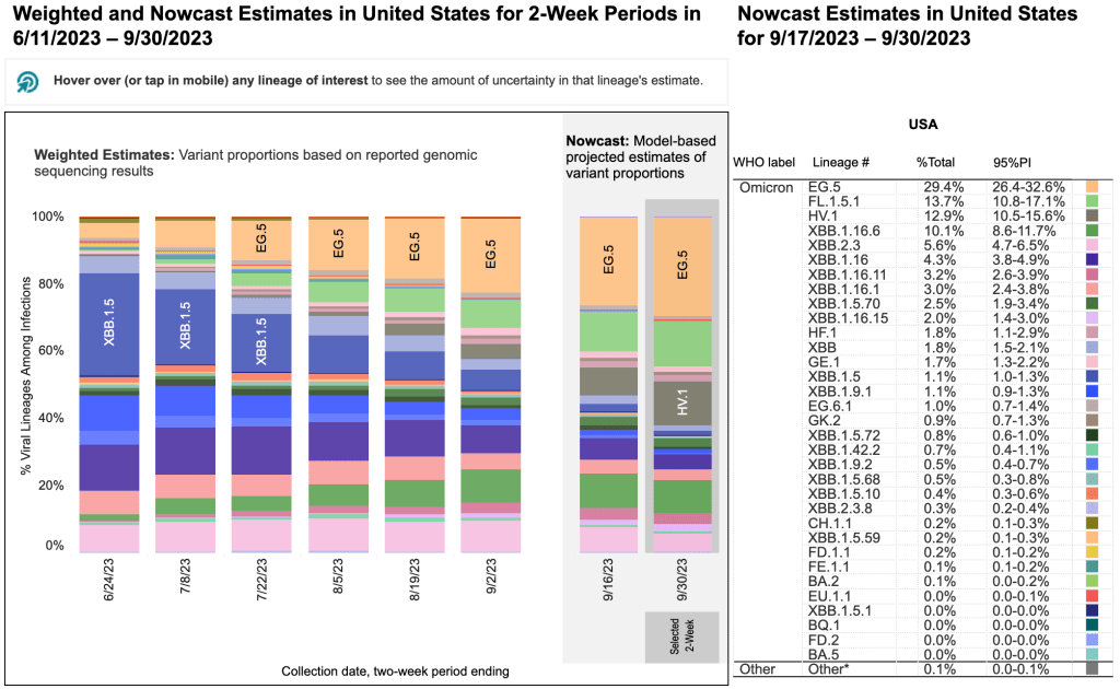From the CDC page on Variant Proportions for the United States. Updated for August 22th, 2023. EG.5 currently represents 20.6% of new cases.
