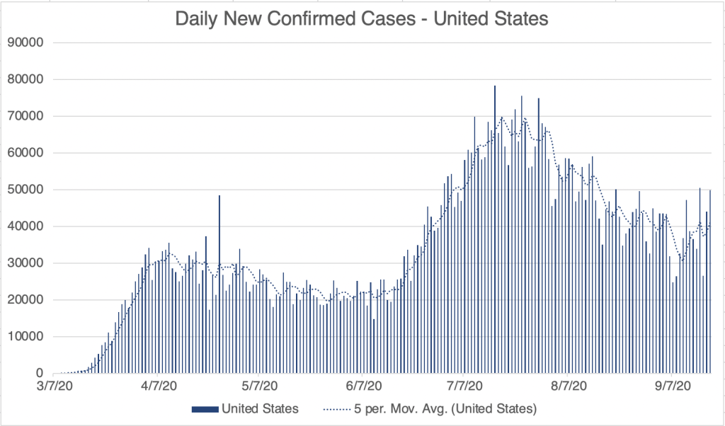 New strain D614G: A new strain appeared in the US and worldwide probably in May or June. Called D614G, it carries a mutation at the 614th position of the Spike protein. This mutation makes the virus more infectious by 4-5 times, and may have contributed to wave Ib of the virus that we saw in June and July. Dr. Deborah Birx, White House Coronavirus Response Coordinator, has speculated that this mutation may be why we saw more widespread virus outside urban areas during the last jump in cases.