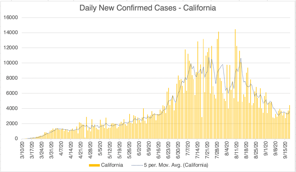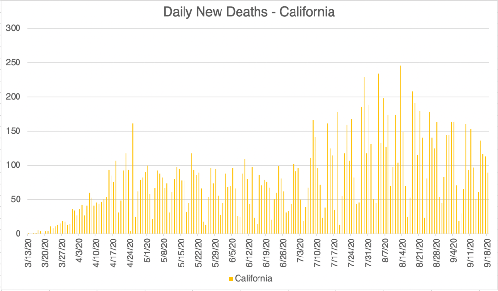 Update: New confirmed cases continue to go down for the US, California and San Diego County. For California, the numbers are kind of flat. The reporting system in California was broken for much of last week, but the state says it’s working again. Death rates are coming down from their second peak. Comparing the new daily case numbers and the new death numbers make it clear that the virus has become much more survivable than it was in March and April.