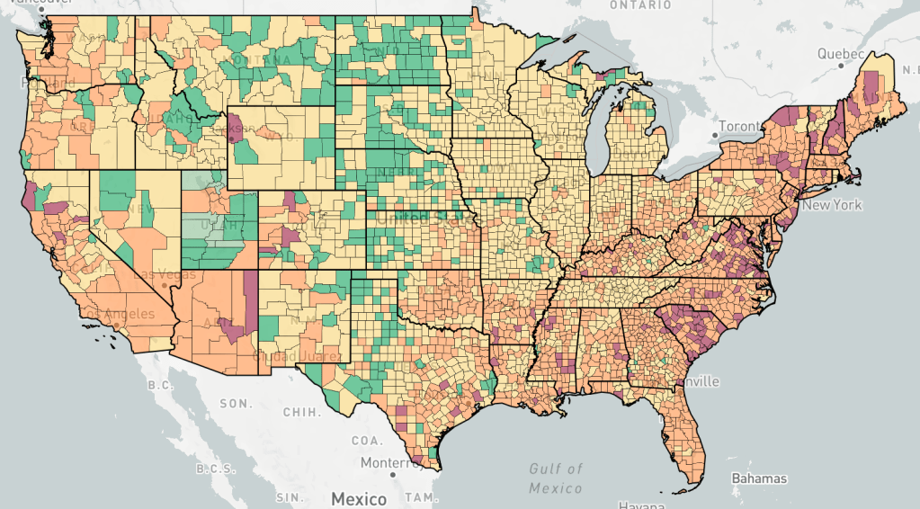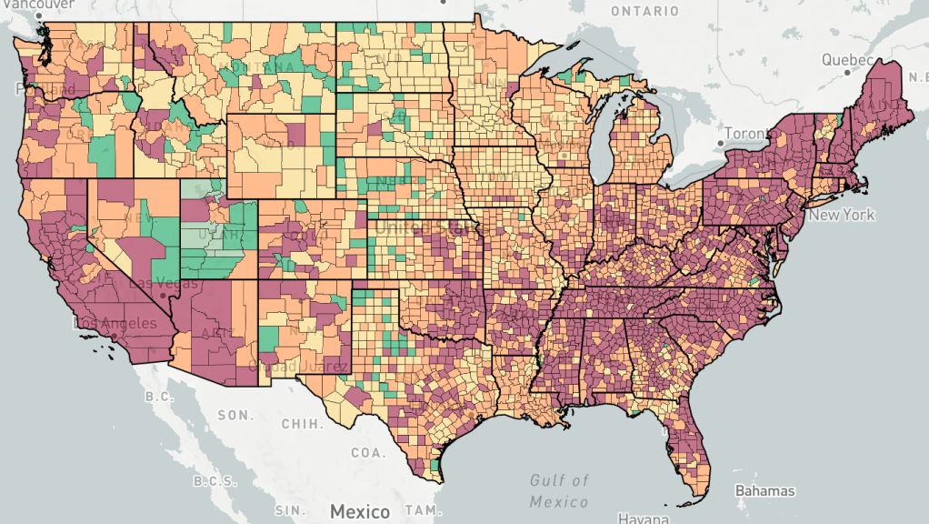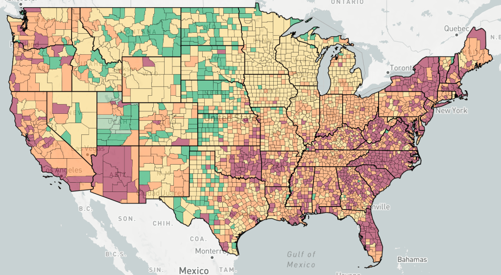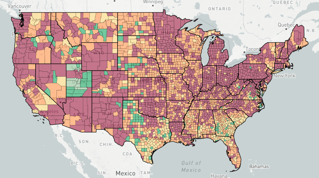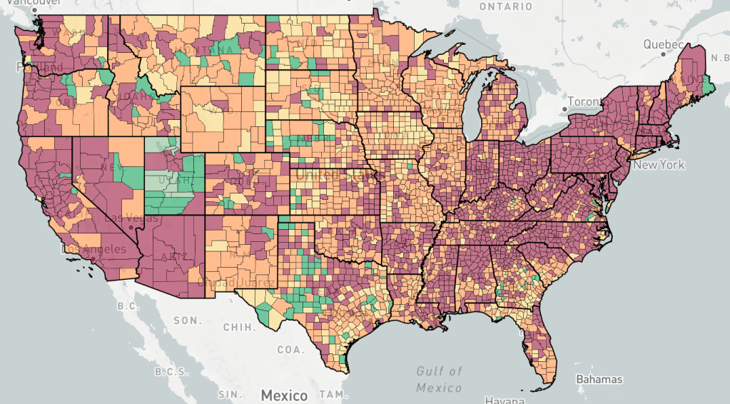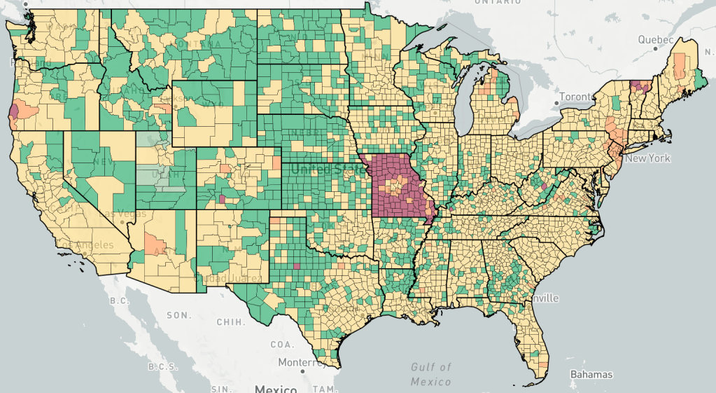 Counties are colored based the change in cases, not the number of cases. Red is increasing cases, orange is falling or constant cases, yellow is cases almost under control, dark green is cases under control, light green is no cases.