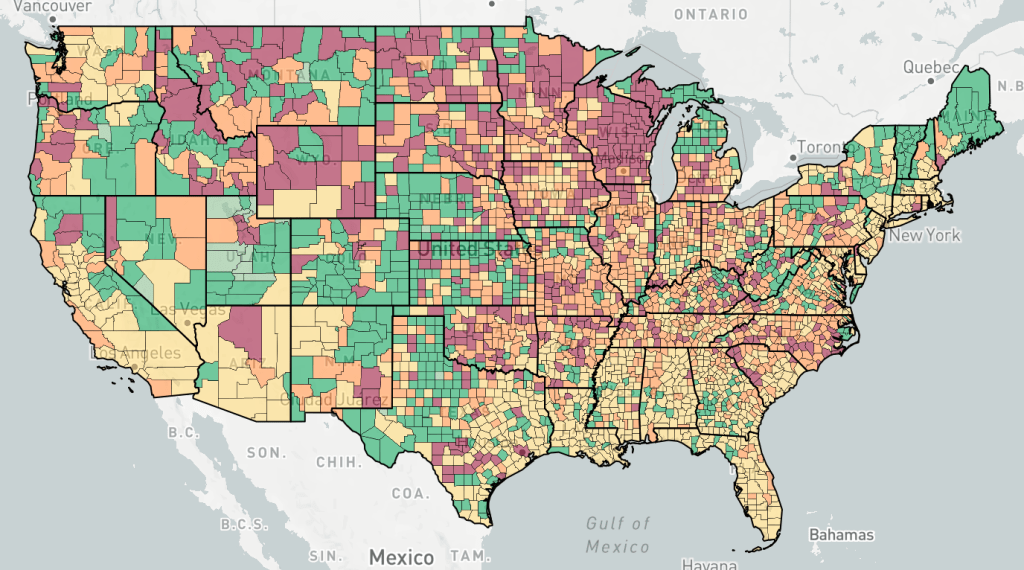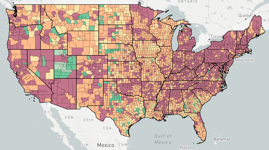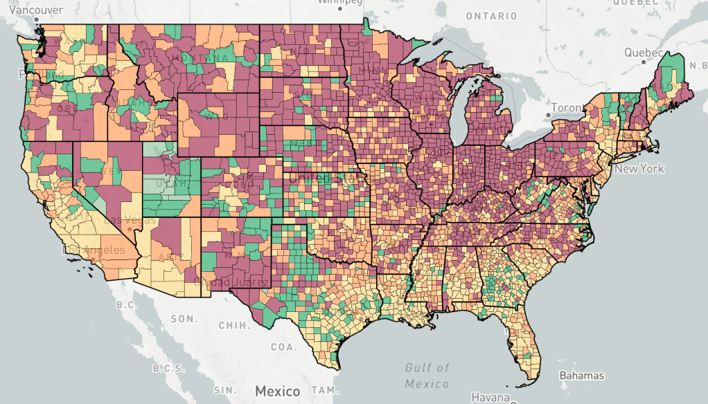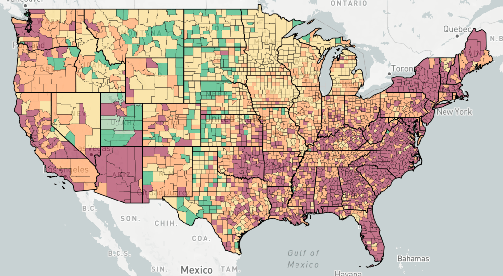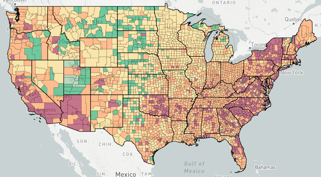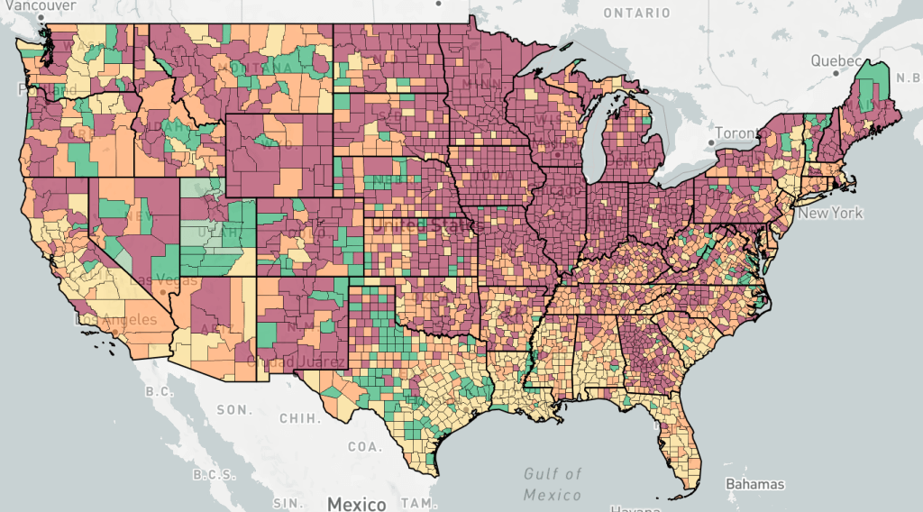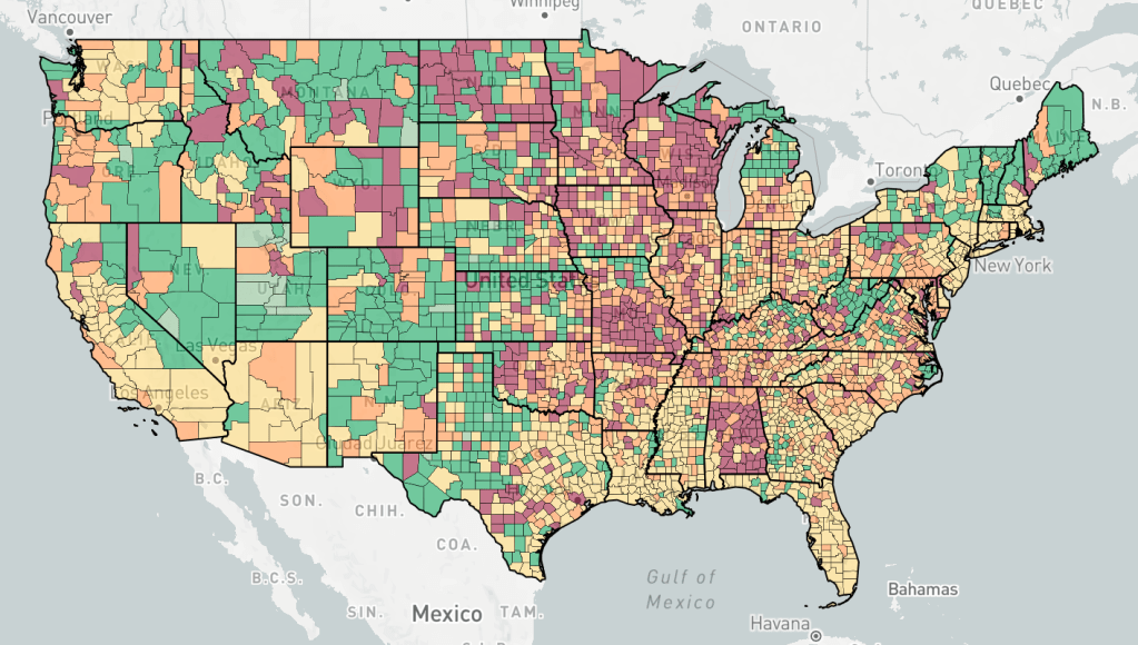 Counties are colored based the change in cases, not the number of cases. Red is increasing cases, orange is falling or constant cases, yellow is cases almost under control, dark green is cases under control, light green is no cases.