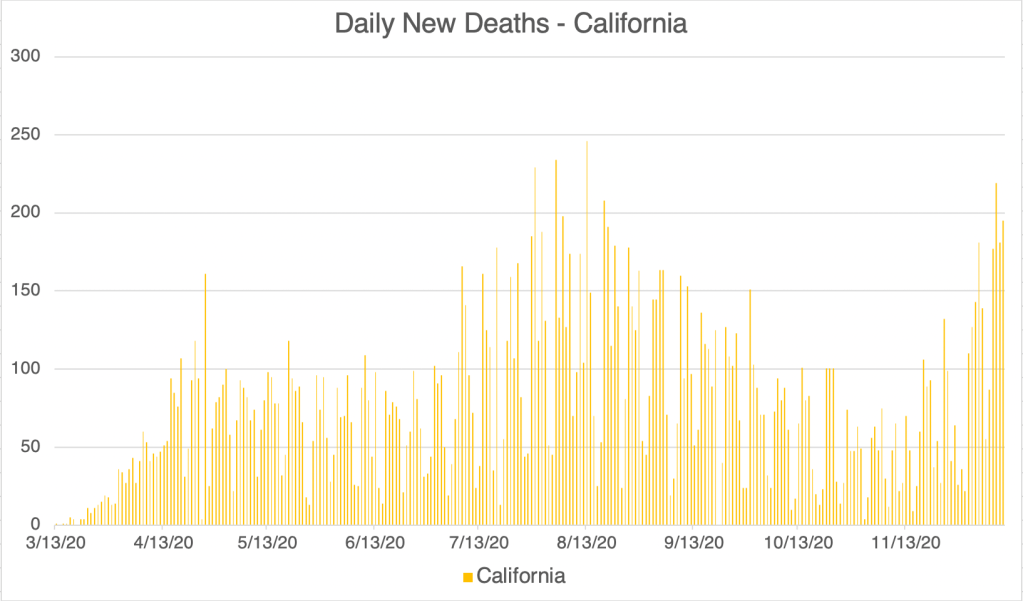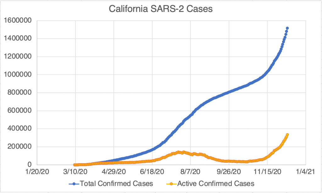 Here’s an overdue case update. Cases continue to rise for the US, California, and San Diego County. The timing of the current US peak makes it clear that the bump is directly related to the Thanksgiving holiday, starting less than a week after Thanksgiving, and after cases had started to come down. LA County currently has more that 100,000 active cases, more than twice the number than the next highest county, Cook County, the home of Chicago.