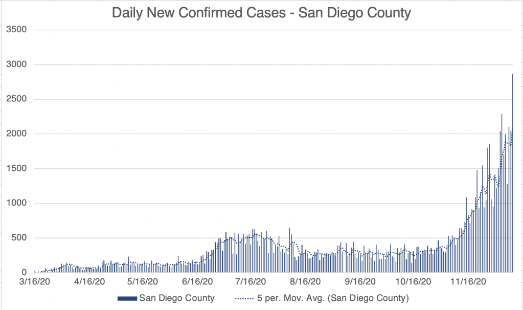 New case numbers have stabilized in California and San Diego County with around 2000 new cases a day in California and 300 in San Diego. We have yet to see a clear uptick in cases in those 2 regions, but we may see this soon.