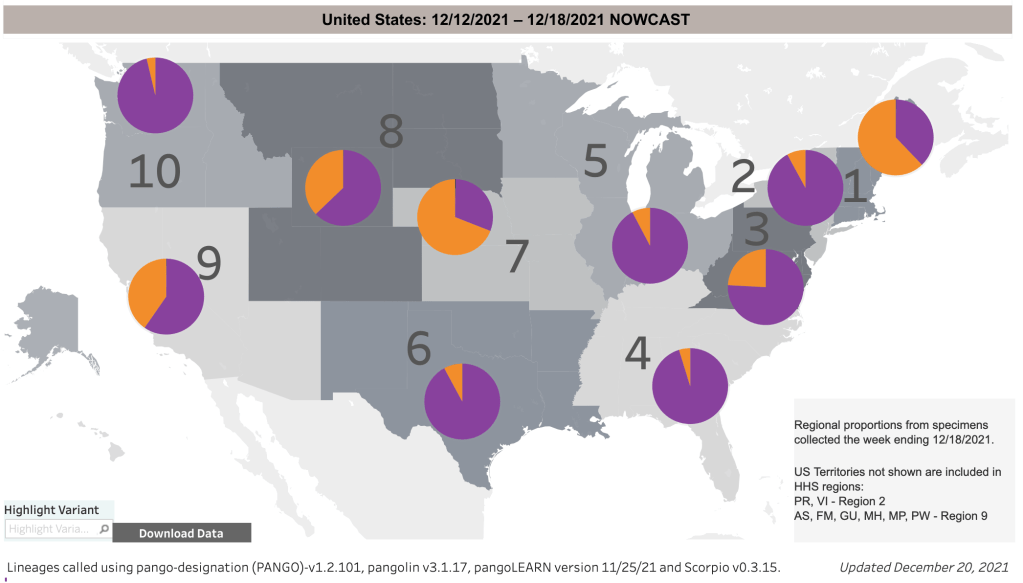 Omicron rapidly overtakes Delta!:In amazing news, cases from Omicron already outnumbers cases due to Delta in the US, and are 90% of new cases in some regions. Last week, the CDC was reporting that 3% of US cases were from Omicron. This week, they revised that number upward to 12%, but also reported that for 12/18, 73% of COVID cases in the US were caused by Omicron, 60% in the Southwest. I expect 95% of cases in the US to be Omicron by next week, and virtually 100% by New Years. This is potentially great news!