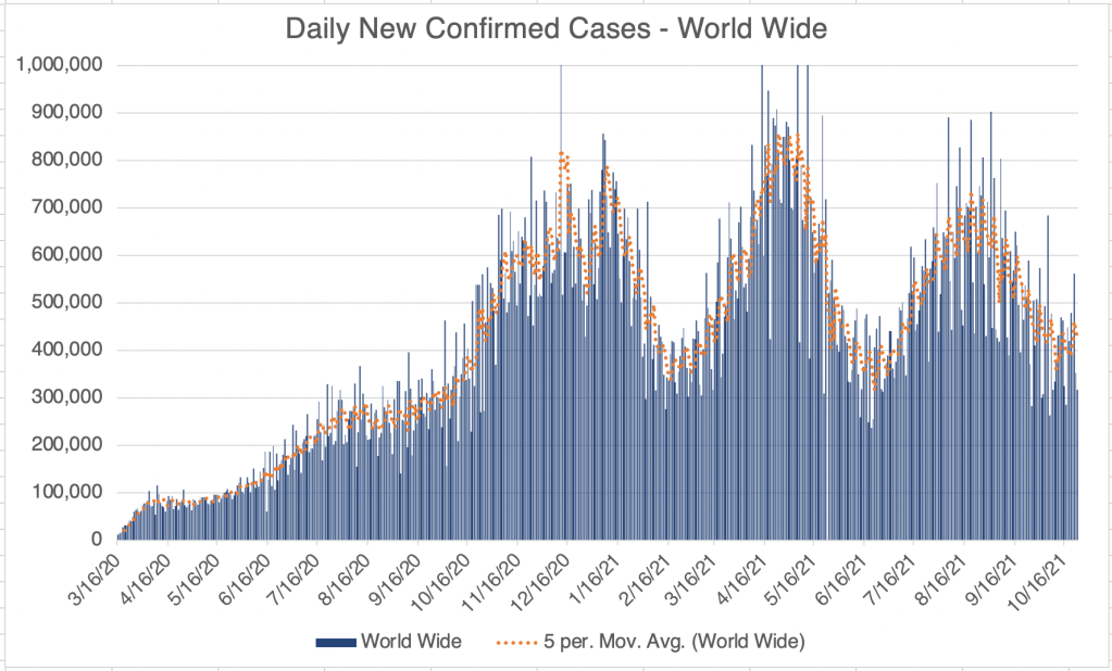 Globally, new cases are at a peak, but reducing for now. However, many countries are starting to experience increasing numbers of Omicron cases.
