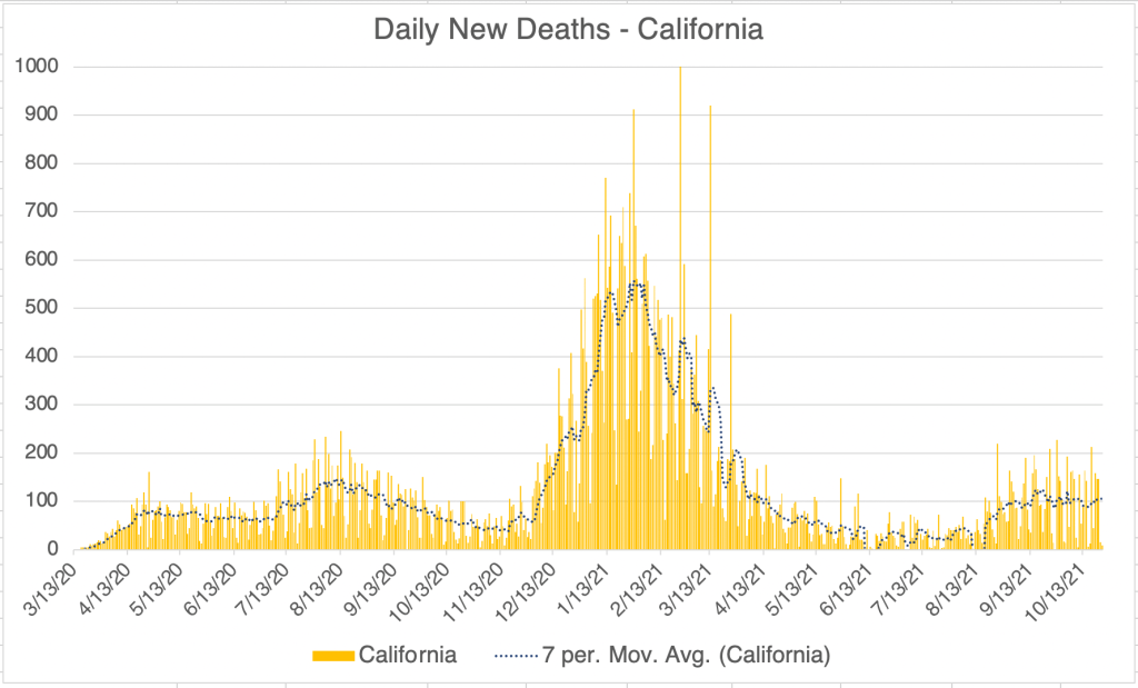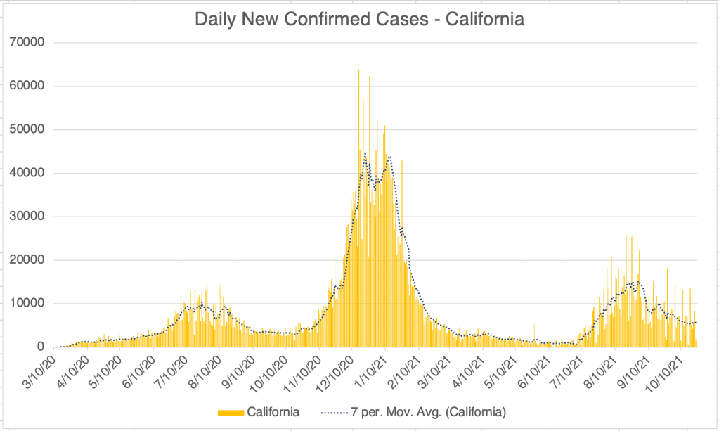 In California, new cases remain at a persistent level after the Delta wave.