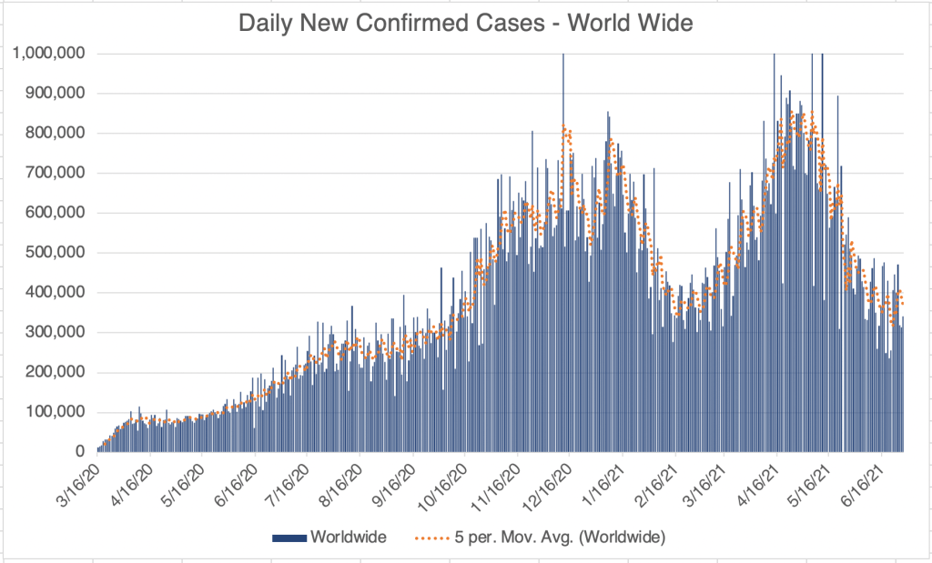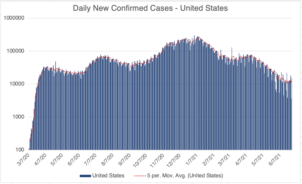Current Status: In late Spring, at least in the US, life began to get back to normal, with approximately 50% of the US population vaccinated, much lower new case numbers, and reduced restrictions. Currently however (July 21, 2021) a wave of infections, likely caused by the Delta variant, is causing concern and some calls for new restrictions. Several other countries scattered across the globe are also currently experiencing peaks in cases.