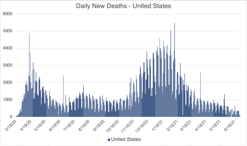 The Future: Since vaccination started in the US, there have been many fewer new cases. This has led many to basically go back to behaving normally. The Delta Variant is rightly causing concern, but I’m still hopeful that the current peak in new cases will be short lived. In other countries with Delta related waves, the peak has been very sharp, with quickly increasing, then quickly decreasing case numbers. However, I’ve started to be a little more cautious in public again, while we wait for the increase in cases to slow.
