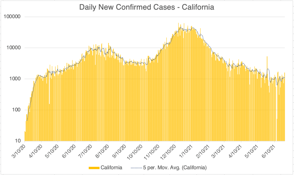 New confirmed cases are starting to creep up in the US, California, and San Diego County. Most commentators are suggesting this is because of the India/Delta Variant which is now percolating into the United States.
