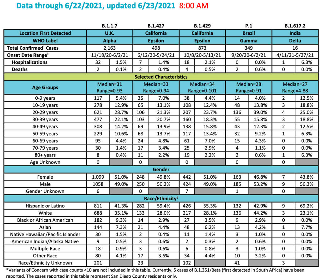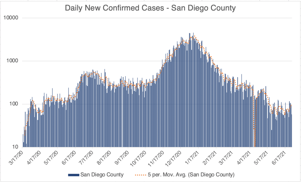 Graph is by me, from data collected from Johns Hopkins University COVID site. Graph is presented in a logarithmic format to emphasize small numbers. Note that each number on the left is 10x higher than the one below it.Graph is by me, from data collected from Johns Hopkins University COVID site. Graph is presented in a logarithmic format to emphasize small numbers. Note that each number on the left is 10x higher than the one below it.Endcoronavirus County Level Map, July 7th, 2021Graph is by me, from data collected from Johns Hopkins University COVID site. Graph is presented in a logarithmic format to emphasize small numbers. Note that each number on the left is 10x higher than the one below it.Graph is by me, from data collected from Johns Hopkins University COVID site. Graph is presented in a logarithmic format to emphasize small numbers. Note that each number on the left is 10x higher than the one below it.Graph is by me, from data collected from San Diego County Public Health. See also regularly updated slides from SD County. Graph is presented in a logarithmic format to emphasize small numbers. Note that each number on the left is 10x higher than the one below it. Numbers are now reported only weekly. While total numbers are accurate, daily numbers are extrapolated from weekly reported numbers.San Diego County COVID-19 Variant Case Summary, July 8, 2021.