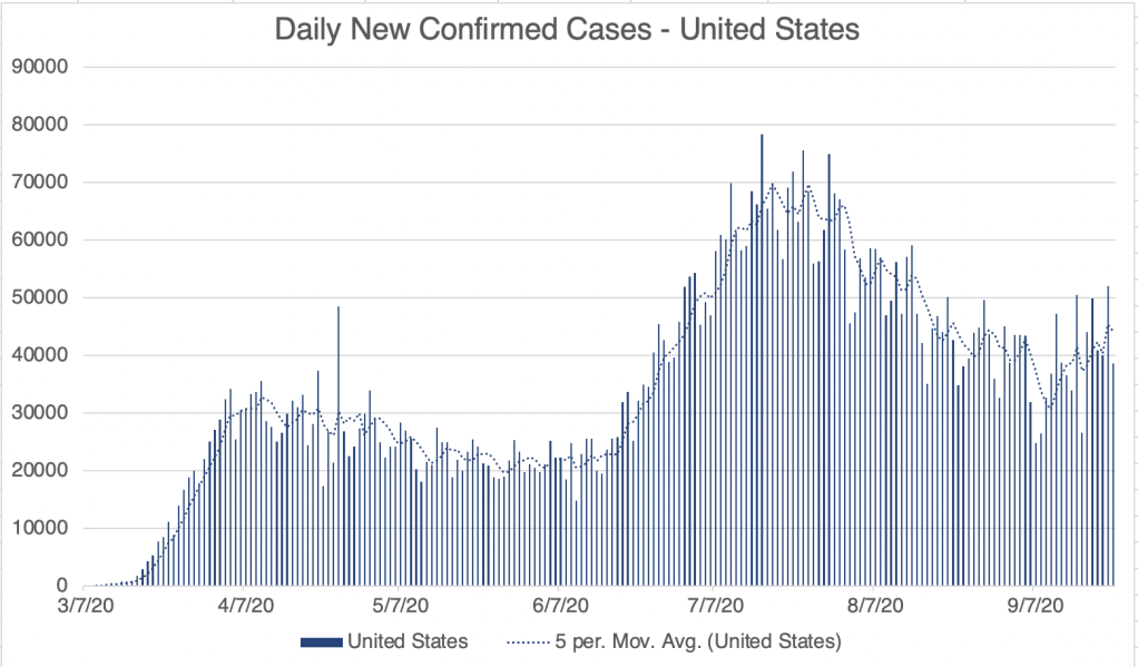 The 2nd wave of cases is apparently over in many places in the US, although not all. The US new confirmed case numbers have risen slightly in the past week. While the southern part of the country, California all the way for Florida, was the epicenter of cases for several weeks, new cases are primarily arising in the North Central part of the country. I might speculate that this might be related to the coming Fall weather, but of course it’s too early to say for now. The US also crossed a threshold of 200,000 total COVID deaths, outpacing a prediction I made several weeks ago that we would have 100 – 200 thousand deaths. California is back down to pre-2nd wave new case numbers, but is not sinking below that. In San Diego County, we had a small wave of cases related to a series of outbreaks at SDSU, but we’re back to a lower persistent new case rate.