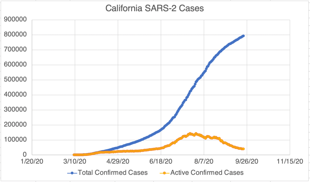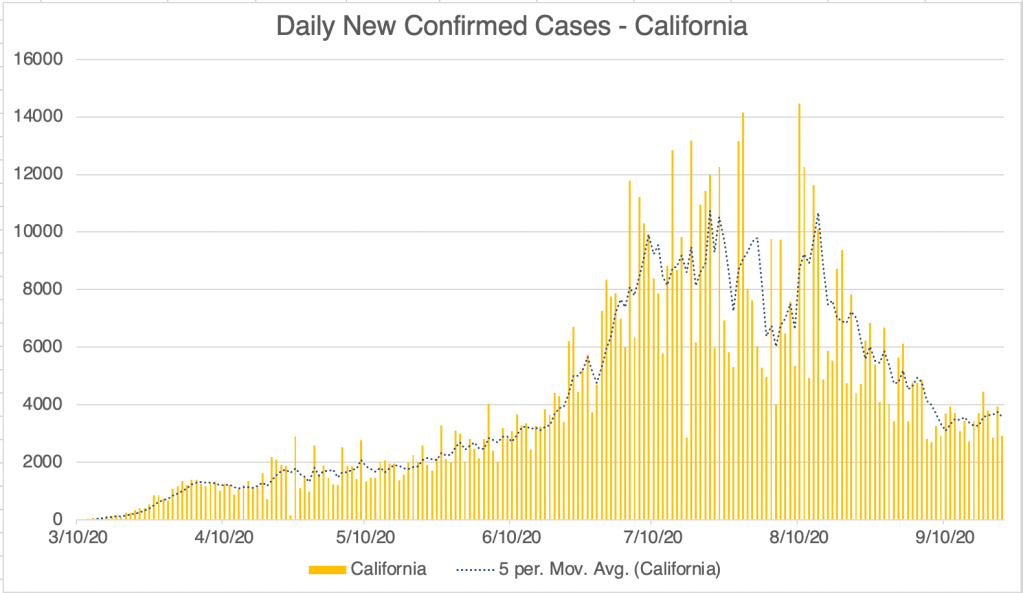 Friends, This is a virus update. I’ll also have a few comments regarding the recent Bob Woodward book. New confirmed cases continue to drop for the US, California, and San Diego. California new case numbers are back down to what they were before the 2nd Wave hit in mid June.