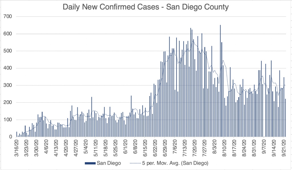 San Diego had a moderate sized outbreak at SDSU in the last few weeks which created a spike in new confirmed cases for the County, but those numbers are coming down as well.