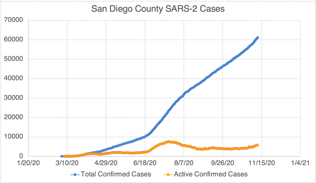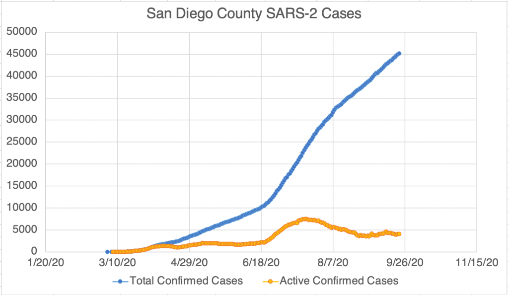 Graph is by me, from data collected from Johns Hopkins University COVID site.Graph is by me, from data collected from Johns Hopkins University COVID site. “Active Confirmed Cases” numbers are calculated based on the assumption that patients confirmed to have SARS-2 virus at least 17 days ago have recovered.Graph is by me, from data collected from San Diego County Public Health. See also regularly updated slides from SD County.Graph is by me, from data collected from San Diego County Public Health. See also regularly updated slides from SD County. “Active Confirmed Cases” numbers are calculated based on the assumption that patients confirmed to have SARS-2 virus at least 17 days ago have recovered.