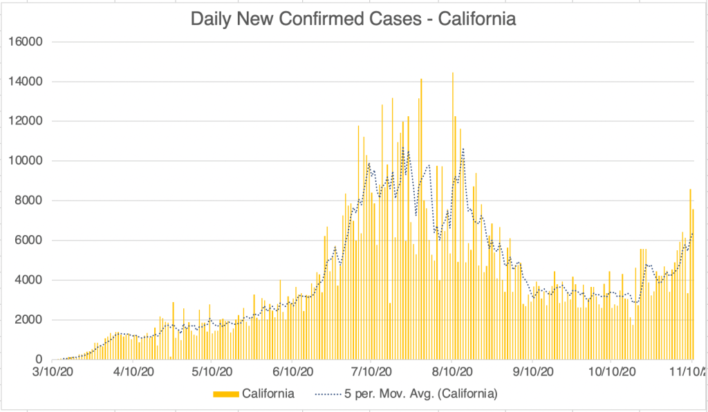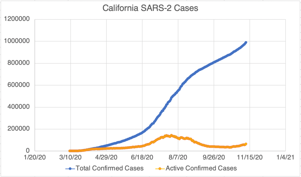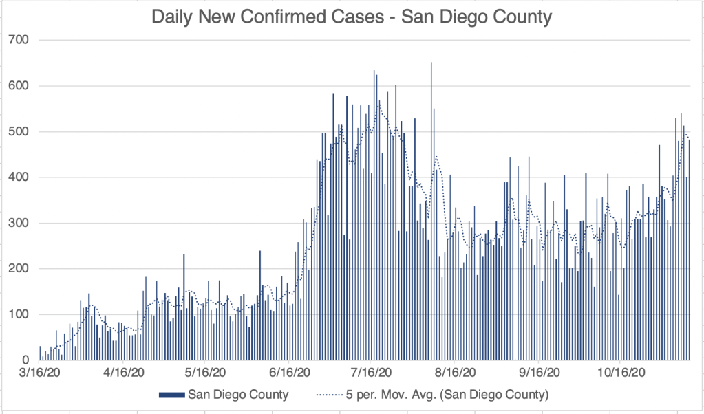 After the end of the 2nd wave, California is experiencing a persistent 3000 new confirmed cases a day, and San Diego County has a persistent 300 new confirmed cases a day. Unfortunately, I’m firmly convinced at this point that COVID may be with us at least until next Spring. As you know if you’ve been reading my posts, I think we will need to adapt to this situation, and open up our economy and normal life as much as possible, while still taking precautions.