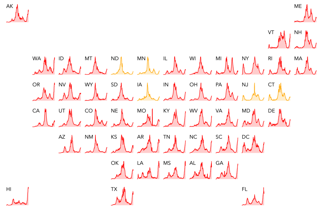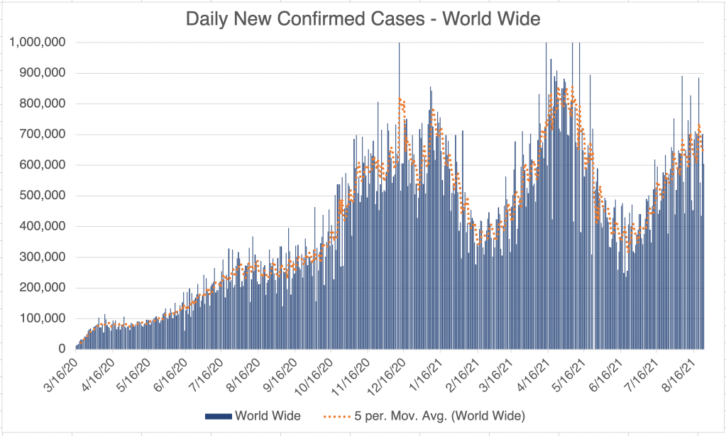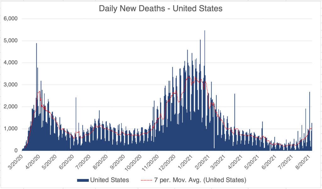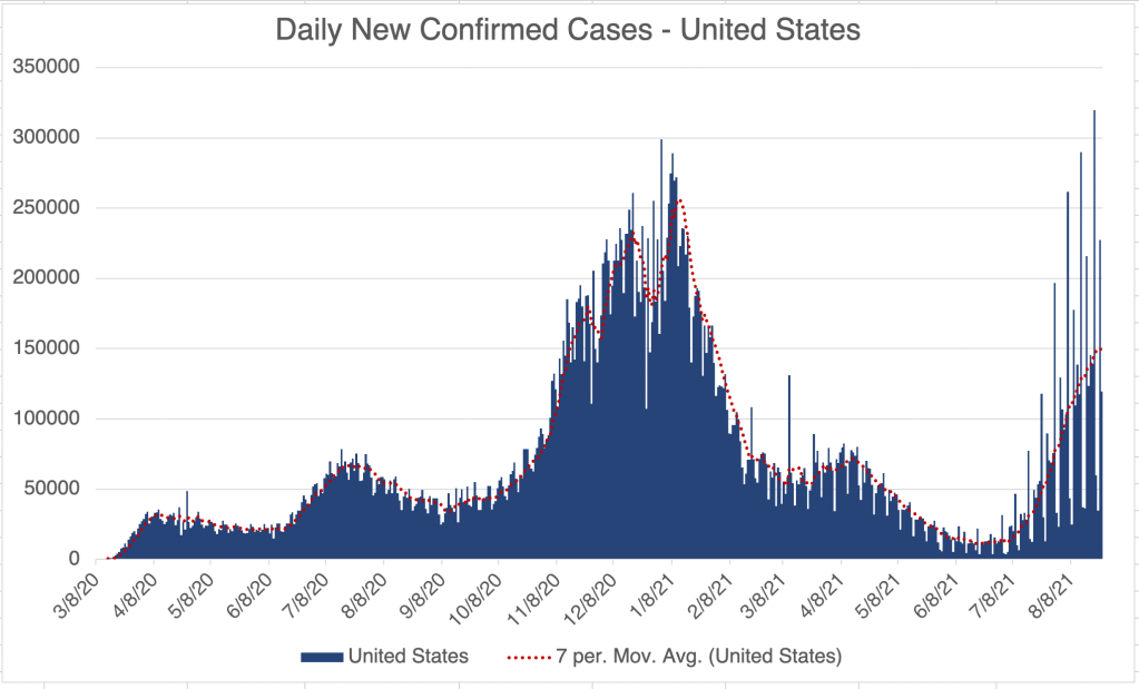 The Delta wave continues to wane in the US, with cases overall continuing to go down sharply. This is great news, but I have to caution that last year’s Fall/Winter wave started in October, so there is a chance we will see a new wave starting in the Northern states. In fact, cases are starting to increase right now in Minnesota, Wisconsin, Michigan, and Maine, while they are going down in the Southern states.