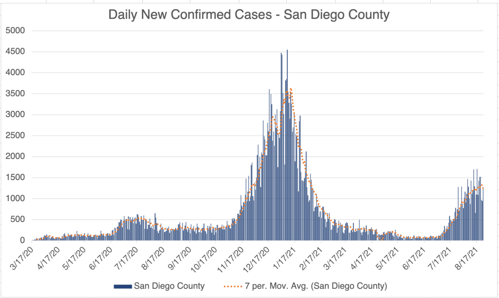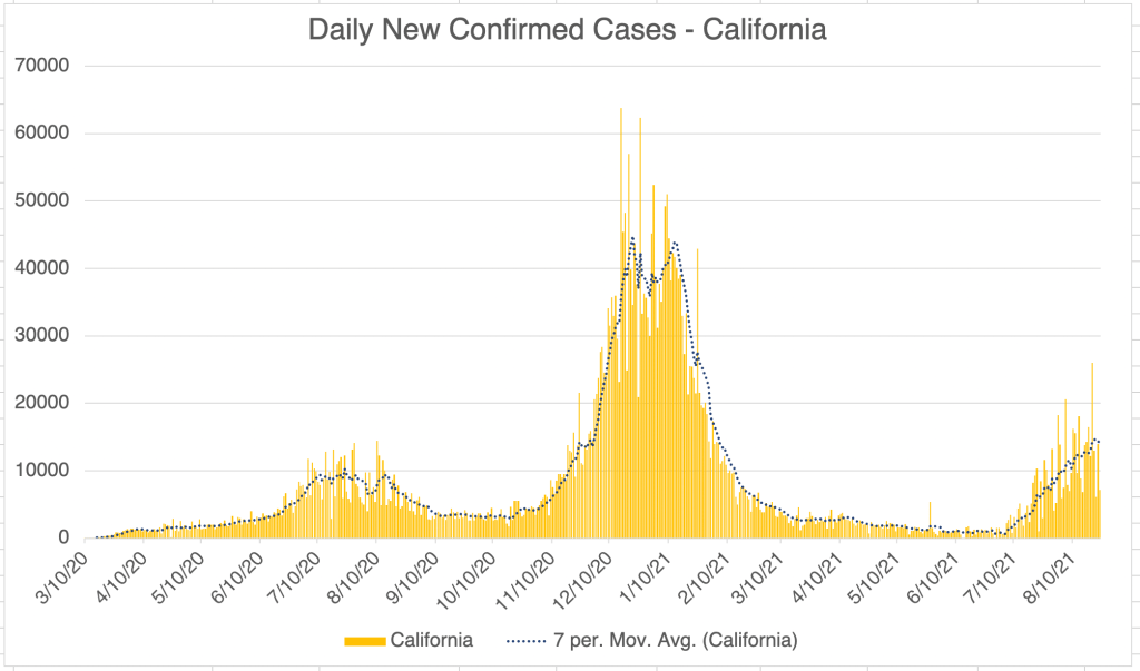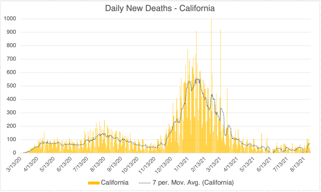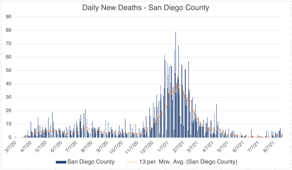 Cases are also going down in California and San Diego, although there was a spike in cases last week. Since both regions saw the same spike, it suggests that the event causing the spike may have taken place in Southern California, but this is only speculation.